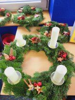 保護者カフェの一環として、多くの保護者の方々がアドベントリース作りを手伝ってくださいました。その結果、10個の素敵なリースが出来上がり、各クラスに配られ、教室に心地よい雰囲気を作り出しました。保護者の皆様のご協力に感謝いたします。